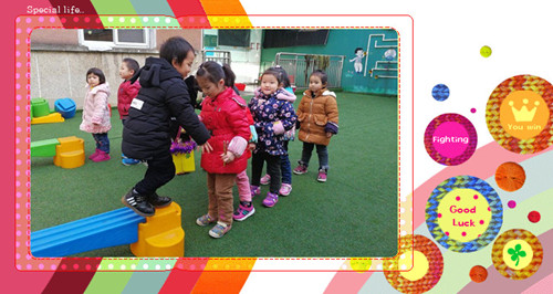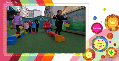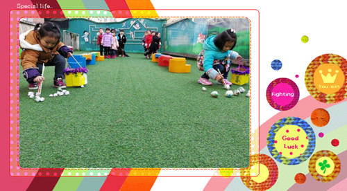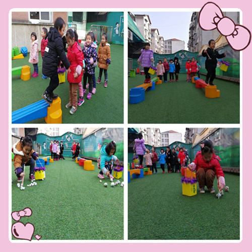 玩法:幼儿分两组,提着牛奶盒做的篮子走过平衡木拾果果,每次只能夹一粒果果,在返回把篮子传给下一位幼儿,哪组先拾完哪组就获胜。