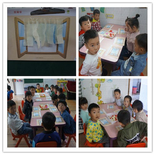 孩子们将自己动手,尝试将一张张的小纸条(窗帘)粘在窗户上,